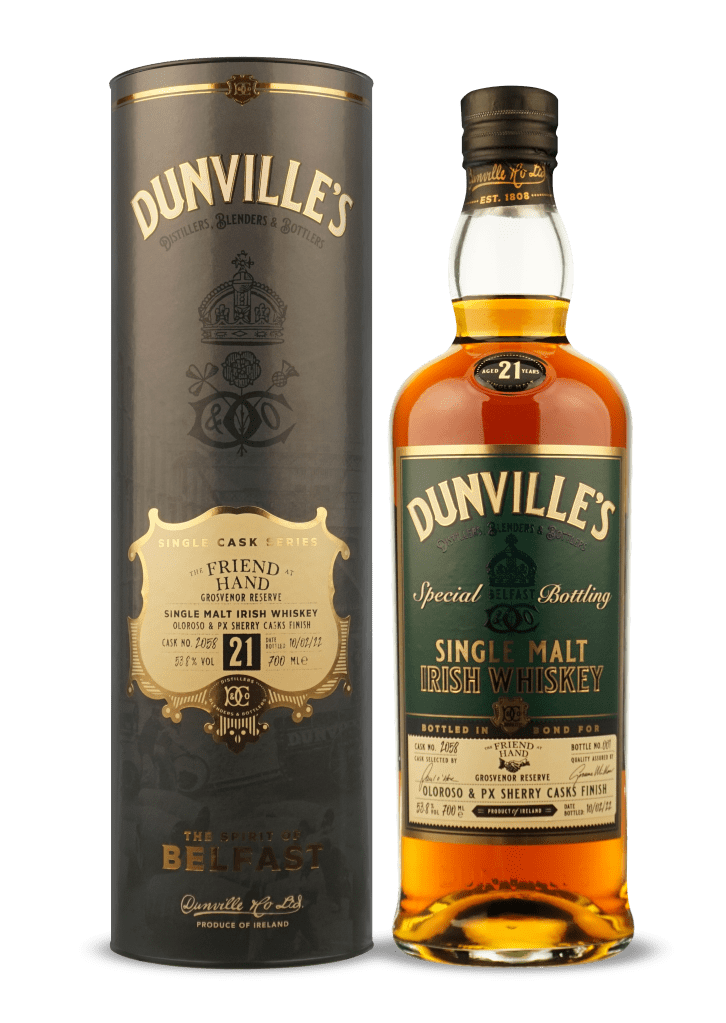 Cask 2058 has been named The Friend At Hand ‘Grosvenor Reserve’ in homage to Belfast’s Grosvenor Road, which was home to The Royal Irish Distilleries – the birthplace of Dunville’s Irish Whiskey and one of the world’s largest whiskey producers. The distillery fell silent in 1936, but the brand was revived by The Echlinville Distillery almost 80 years later and has since earned its place at the forefront of Ireland’s whiskey renaissance with a reputation for exceptional blends, single malts and single casks which have won more than 40 global awards.